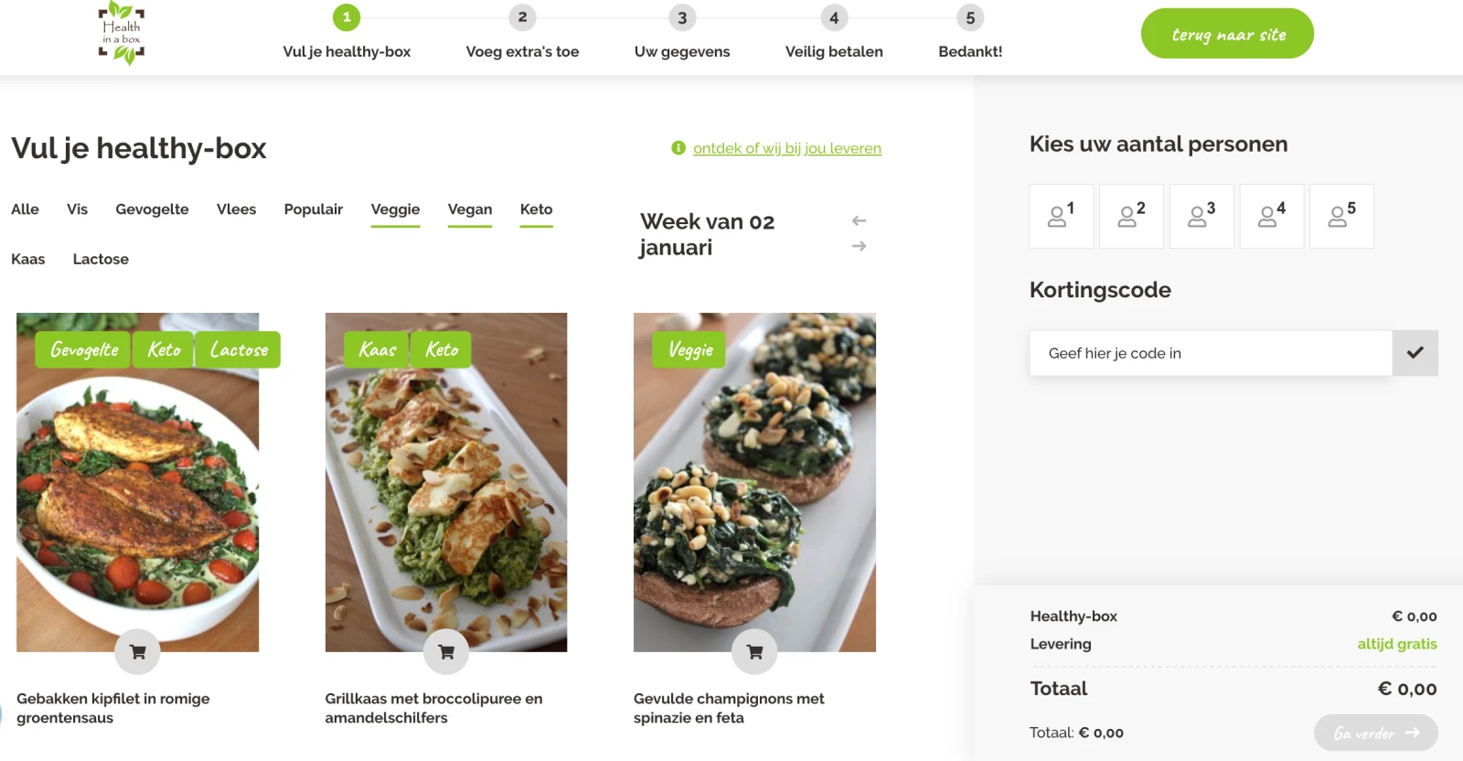 Via een eigen gebouwd bestelsysteem gekoppeld met het CMS, kan onze klant zelf zijn ingrediënten & recepten toevoegen voor een specifieke week. De eindklant selecteert zijn favoriete gezonde gerechten op basis van verschillende categorieën zoals veggie, vlees, vis, ... Van zodra de recepten zijn toegevoegd aan de box, kan de eindklant nog extra's toevoegen voor die extra gezonde touch. Bij de bevestiging en betaling van de box, zal de healthy doos bezorgd worden bij de eindklant thuis.